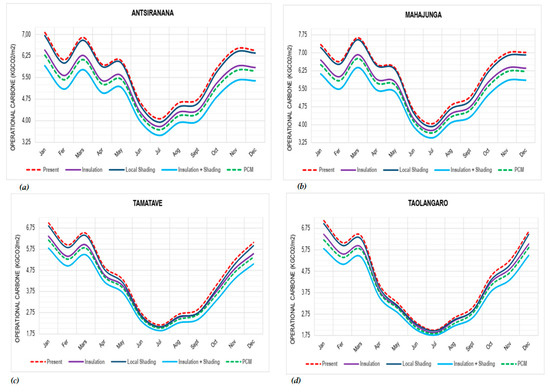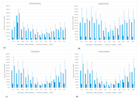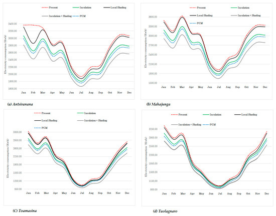 Figure 7 shows the annual quantity of electricity consumed for cooling, lighting, etc., in this office building when it is built in the four cities. The main results showed an estimated annual electricity consumption of between 88.2 and 121.3 kWh/m2 in the four cities, and this amount is estimated to between 81.7 and 110.7 kWh/m2 after setting 5 cm of insulation on the walls and roof, between 79.0 and 107.8 kWh/m2 after setting 7.4 cm of PCM material, and between 74.1 and 101.6 kWh/m2 after combining insulation and building shading. At the same time, an electricity consumption between 30% and 40% bigger in the hot tropical coastal (e.g., Mahajunga city) than in the humid tropical coastal region was observed (Toalagnaro city). The distribution of electricity consumption per strategy is shown in Table 5. The PCM has a very significant effect on the indoor climate. Indeed, Sovetova et al. [9] showed that optimal PCMs are capable of reducing temperature fluctuations and the maximum temperature up to 2.04 °C.