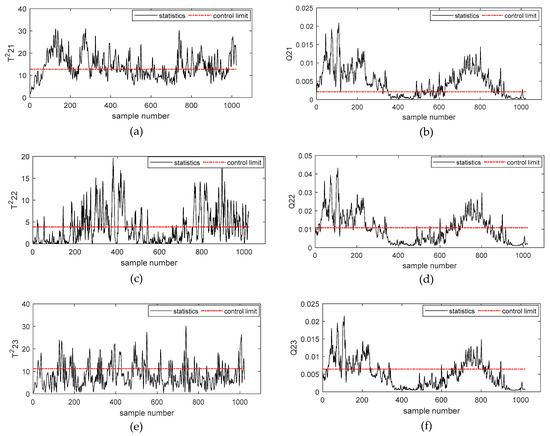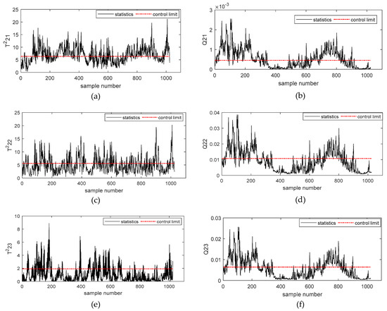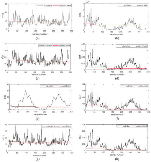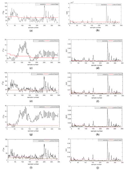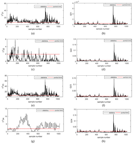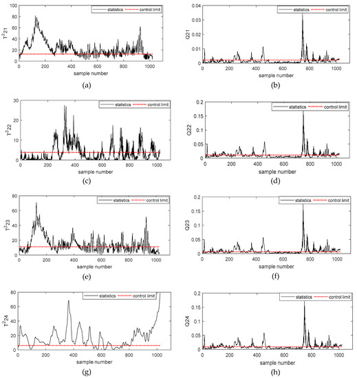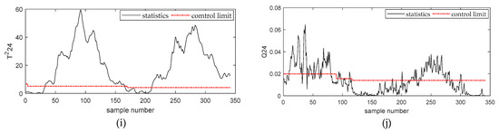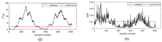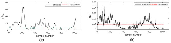 Figure 7a–h describes the simulation results of and statistics of the second-order subspace – based on the Deep DKPCA method, respectively. Figure 7a,g describes the detection results of incipient failures of rolling bearing outer rings of and , the rolling bearing outer rings fault could be successfully detected by and . From Figure 7c, we could obtain that this fault had no obvious influence on .