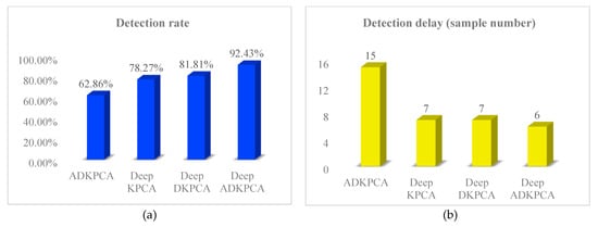 This section compared the experimental results of ADKPCA, Deep KPCA, Deep DKPCA, and Deep ADKPCA by analyzing the failure detection rate and detection delay of the incipient failure experimental results of rolling bearing rolling elements.