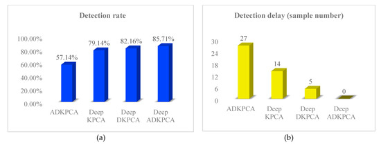 Figure 12a shows the fault detection rate of the rolling bearing rolling body fault by ADKPCA, Deep KPCA, Deep DKPCA, and Deep ADKPCA method. The failure detection rate of the ADKPCA failure detection method was 57.14%, which proved that this method basically did not have incipient fault detection capability. The fault detection rate of Deep KPCA and Deep DKPCA was about 80%, compared with ADKPCA method the detection rate had increased, but the detection capability still needs to be improved. Deep ADKPCA had a fault detection rate of 85.71%, which was significantly higher than other methods, and had a certain incipient fault detection capability.
