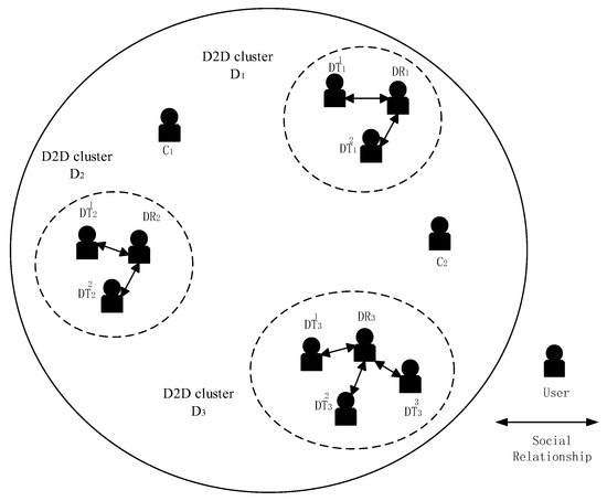 Users’ social attributes can be represented as social domain , where indicates the users corresponding to users in physical domain and denotes the social relationship between D2D users. Social relationship can be defined as , . A larger means a closer social relationship and users should be more willing to cooperate with each other.