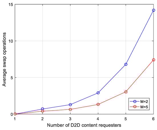 Figure 4 shows the impact of the number of D2D content requesters on the average number of swap operations in the matching game. As the number of D2D content requesters increases, the number of swap operations also increases, which indicates that the number of swap-blocking pairs in the system increases. In the meanwhile, the number of cellular channels could affect the number of D2D users who can access the cellular channel. Hence, the number of potential swap-blocking pairs increases as the number of cellular channels increases. Therefore, both the cellular channel and D2D content requester could affect the swap operations. When there are 6 D2D content requesters and 5 cellular channels in the cell, the average number of swap operations is about 15. As a consequence, the matching game converges with a small number of iterations.