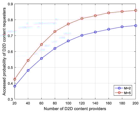 Figure 5 shows the impact of the number of D2D content providers on the accessed probability of D2D content requesters. D2D accessed probability indicates that D2D users communicate through D2D mode, which depends on two conditions: (1) the D2D content requester succeeds in finding D2D content providers within the D2D communication range, and filters them into the D2D cluster and (2) the D2D cluster communicates by reusing the cellular channel, and each user’s QoS must be ensured on the cellular channel. If any user’s QoS cannot be ensured, the D2D content requester in this D2D cluster cannot communicate in the D2D mode. It can be seen from Figure 5 that as the number of D2D content providers increases, the D2D accessed probability continues to increase while the trend slows down. This is because D2D content providers correspond to the first condition we proposed. As the number of D2D content providers increases, the possibility of forming the D2D clusters increases. Hence, the D2D accessed probability increases. However, it becomes saturated for D2D content requesters with more and more D2D content providers, and more D2D content providers are less meaningful for clustering. As a consequence, the curve tends to be flat. Moreover, the number of cellular channels corresponds to the second condition. The more cellular channels, the more channels D2D users can choose, which also has a certain impact on D2D accessed probability.