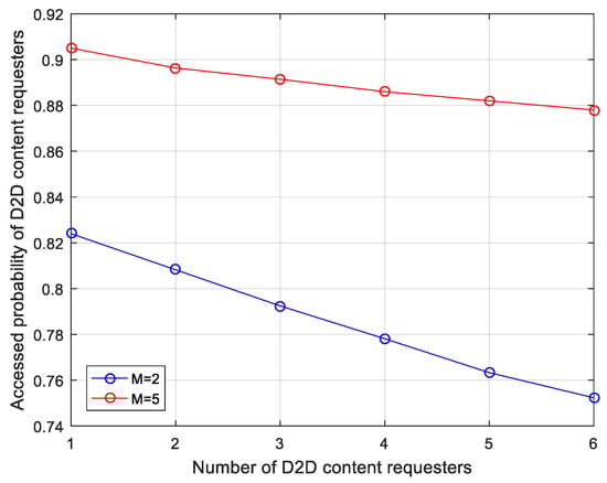 Accessed probability for different numbers of cellular channels with different numbers of D2D content requesters, .