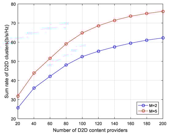 Sum rate of D2D clusters for different numbers of cellular channels with different numbers of D2D content providers, .