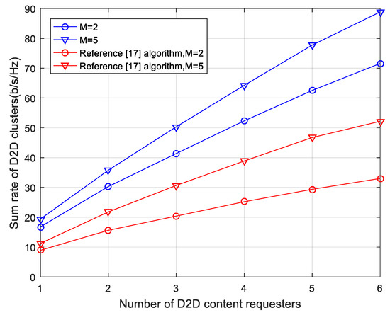 Figure 8 illustrates the impact of the number of D2D content requesters on the D2D throughput. Along with the increase of the number of D2D content requesters, the D2D throughput continues to increase. It can be seen that D2D throughput increases at a faster rate when the channel resources are sufficient because of the relatively small interference. Moreover, our algorithm is obviously superior to that in Reference [17] because of the one-to-one D2D communication Reference [17] uses. Since [17] did not consider NOMA in D2D groups, the throughput is lower than that in this paper, and our advantage becomes larger with more D2D users.