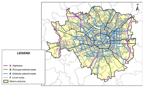 Road traffic noise monitoring in Milan has a long-standing tradition, leading to a large database across the years. From this database, a set of 90 sites was considered to represent the different types of roads according to the Italian road functional classification, that is, motorway (class “A”), thoroughfare roads (class “D”), urban district roads (class “E”), and urban local roads (class “F”). The selected roads sample is representative of the urban road network in Milan and its spatial distribution of road types in the urban area is given in Figure 1.