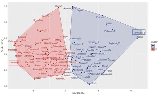 Bi-dimensional plot of the two clusters obtained by k-means. Dimension 1 and 2 explain 37.8% and 13.7% of the variance, respectively. The rectangular frames highlight the two sites with the greatest distance (dissimilarity) between them in the bi-dimensional plot.
