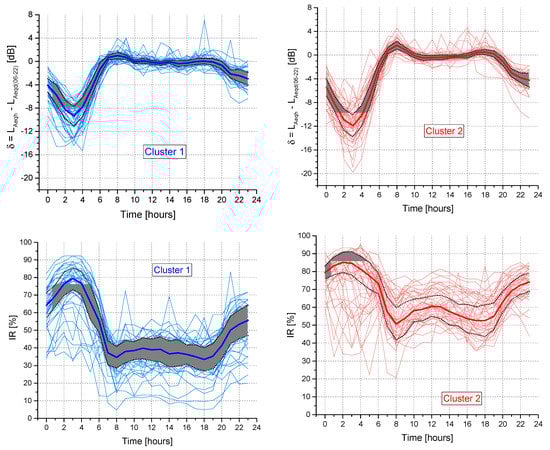 Figure 3 reports, for each cluster, the 24-h pattern of the hourly median values (thick lines) ± the median absolute deviation (MAD, grey area) for both δ and IR, as well as the observed time pattern (thin lines) for each of the sites included in the cluster. The patterns show that, in the night period (22:00–06:00), the IR values are the highest for both clusters because of the presence of noise events clearly emerging above the background noise, which is lower than that observed during the day-time. The hourly IR values for cluster 2 are higher than those for cluster 1 because the traffic flow for the sites belonging to cluster 2 is lower (mainly local roads) than that for the sites belonging to cluster 1. Figure 4 shows the straight comparison between the time patterns for the two clusters. The largest differences between the two clusters are observed during the night-time for δ and between 10:00 and 16:00 for IR. Thus, these periods are the most suitable to discriminate between the two clusters.