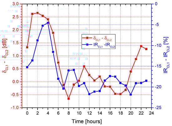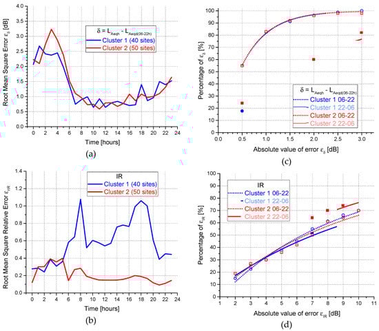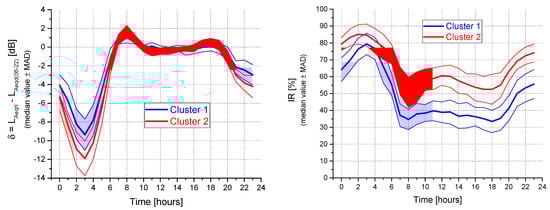 For practical application, the RMSE error in dB was considered for the δ parameter because it is more representative (Figure 6a), whereas for IR, measured in %, the relative error εr was chosen and is reported in Figure 6b. For all the sites belonging to the same cluster, the εi absolute values for each ith hour were determined and grouped (in %) in an interval bin width from 0.5 to 3 dB with steps of 0.5 dB. The median values of these percentages for each interval width were determined for the day (06:00–22:00) and night (22:00–06:00) periods and are plotted in Figure 6c,d, together with fitting curves. No large differences between clusters are observed for the error εδ determined for δ; the largest values of RMSE error (Figure 6a) and the lowest values of the percentage of εδ (Figure 6c) are observed for the period 00:00–05:00 (median error εδ > 2.0 dB), which, on the other hand, is the most suitable to discriminate between the two clusters. The relative error εrIR for IR is greater for cluster 1 during the day-time (06:00–22:00) (Figure 6b, median error εrIR = 0.63).