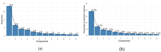 Eigenvalues (a) and percentage of explained variance (b) for the first 12 principal components.