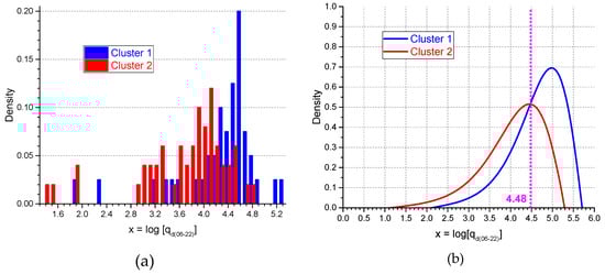 Figure 7a shows the histograms of the data (bin width of x = 0.1) according to their cluster membership. It can be seen that, for 12 out of 26 bins (46.2%), there is an overlap between the two distributions. In order to figure out a threshold value to discriminate the cluster membership, the procedure to determine an analytical representation of the distribution functions in each cluster, as described in [,], was applied. The probability distributions for the two clusters P(x) can be obtained from the analytical fit of the cumulative distribution I(x) according to the following relationship: