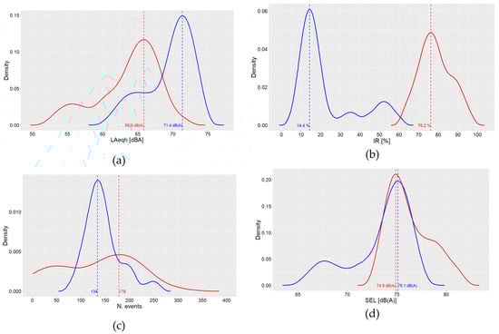 Density plots of 24 hourly values of acoustic parameters LAeqh (a), IR (b), number of events (c), and sound exposure level (SEL) (d) for two sites belonging to different clusters (blue = cluster 1, red = cluster 2) and far away from each other in the cluster bi-plot (see Figure 2). Dotted lines show the mode of the density distributions.