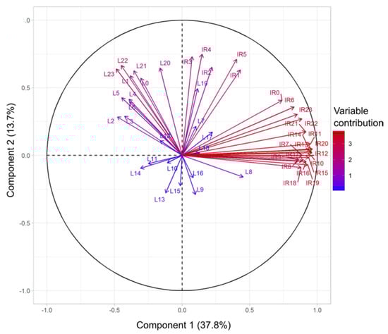 Correlation plot of the principal component analysis (PCA). Component 1, describing 37.8% of the data variability, can be associated with the eventfulness of the noise (IR), whereas component 2, describing 13.7% of the data variability, can be associated with the noise energy (LAeq). L## stands for LAeqh and IR## for IRh.