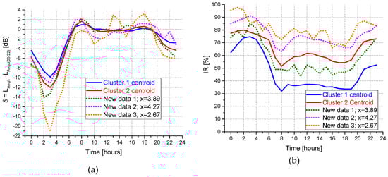 To give an example of application of the above data classifications, let us consider three new roads for which the hourly values of δ and IR, dotted lines in Figure 11, as well as the non-acoustic parameter x, are known. According to the categorization based on x, because for all the three roads, the x value is less than 4.48, they should be classified into cluster 2, the centroid of which is also given in Figure 11, together with that of cluster 1. Running the k-NN algorithm with k = 1, all three roads are recognized to belong to cluster 2 as well. Thus, for these data, both classification criteria, based on clustering and the parameter x, agree in the cluster membership assignment.