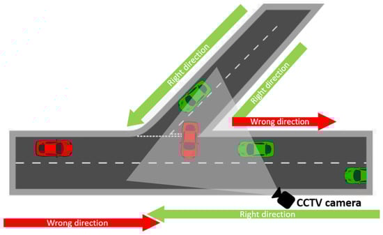 With the development of the fourth industrial revolution, the role of the intelligent transportation system (ITS) is becoming more and more crucial for ensuring the safety and efficiency of drivers. The purpose of a vision-based ITS is to extract useful and precise traffic data, and to use surveillance technologies as efficiently as possible. According to the National Information Society Agency, there were more than eight million closed-circuit television (CCTV) cameras installed in Korea by the year 2018, which gives the country one of the highest cameras-per-capita rates in the world. CCTV footage certainly cannot be a perfect solution for all traffic violations. However, it is widely and increasingly used by government officials to identify serious violations, along with evidence, testimonies, and documents. Typically, driving the wrong way down a road happens for several reasons: the driver is distracted or confused; the driver did not notice the pavement markings or traffic signs; the driver intentionally breaks the rules; etc. Even though recent pavement delineations and signs are innovative, they might not be enough to alert drivers to wrong-way entry, and car accidents continue to happen. Even though it is almost impossible to control human driving behavior, it is important to classify and understand irregular activity in usual traffic scenarios in order to prevent serious car crashes. So far, the identification task is performed by people who work in monitoring companies. Nevertheless, with the significant increase in camera devices, the need for automated intelligent software is demanded even more. Wrong-direction detection technologies can be divided into three major categories: sensor-based detection, radar-based detection, and video imaging-based detection. The focus of this research is to automate the recognition of moving violations, thus requiring less human interaction, as well as to identify (using a single video camera) vehicles entering traffic the wrong way onto the highway system (Figure 1).