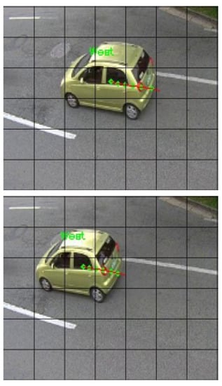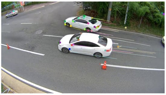 One of the machine learning methods for locating a car is an optical flow which is the pattern learning of a moving object. The most widely used optical flow method in computer vision is called the Lucas–Kanade method [4]. The basic idea of optical flow is to assume that the color or intensity of a pixel is constant under displacement from one frame to the next. This optical flow estimation algorithm also assumes that an object’s frame-to-frame displacement distance is small and local. In addition, the objective measurement of the local level of reliability of motion information is provided. Shi and Tomasi [5] increased tracking performance by modifying the “good feature” selection criterion of reliability in order to evaluate the texture features of areas, which later led to the creation of the Kanade–Lucas–Tomasi (KLT) tracker [6] (see Figure 3). However, according to Barron et al. [7], optical flow computation techniques are very sensitive to noise and object illumination. Generally, optical flow can be unreliable in cases where the brightness intensity changes, and object occlusions happen. Since our task in focus requires a minimal error rate, usage of optical flow as a detector could be unacceptable due to the changing lighting and weather conditions.
