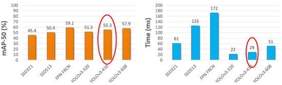 We manually counted the number of cars that appeared within the mentioned intervals and annotated them to determine the cars’ positions in a frame. We counted only unique cars. The car was considered as correctly detected one only when the IOU rate was above 0.75. As seen in Table 1, the detection method identified cars with average mAP of 90.80% for both daytime and nighttime. The reason for the slight change in mAP is the different lighting conditions. Since our application is supposed to be used in real-world scenarios, we tested it for precision and speed. Therefore, along with precision, we also checked the processing time of our algorithm, which was similar to that of Redmon and Farhadi [16]. Despite having only one class to detect, we achieved a higher mAP score than the authors of the original YOLOv3 (see Figure 4).