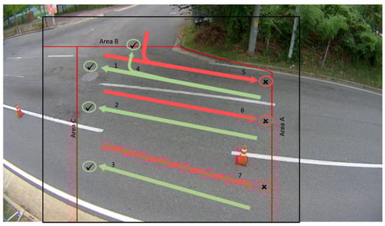 As seen in Figure 7, we crop the video frame to the required region of interest. Traffic must go from the right side to the left (lines 1–4). Green lines represent correct entry and exit directions. Red lines represent directions in which vehicles must not move (lines 5–7). We create three imaginary areas for entering and exiting. Imagine the usual case when the car enters the first area. In such a case, when the car’s centroid passes through area A, the ID of the car is stored in list 1 and remains there until the car exists from any exit. If the car enters from area B, the ID is stored in list 2 and the car must exit in area C; otherwise, the car will be detected as the moving the wrong way, and a warning signal will be triggered. If the car enters in area C, this is always the wrong way and the ID of the car is stored in list 3 to check the area from which it exited. Even if a car enters from area C, the alert signal is sent when the car is moving. The algorithm validates according to the vehicle’s centroid position.