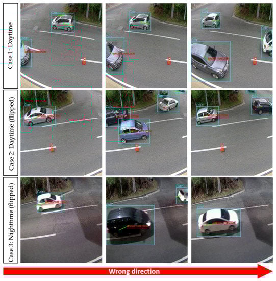 Due to safety reasons, Korean road traffic authority (KoROAD) did not allow us to simulate driving during nighttime. Therefore, for the second and third simulation cases we inverted daytime and nighttime videos as shown in Figure 8 to check true-positive results. Results obtained from the first simulation case can be seen in Table 2 where ‘positive direction’ is the number of cars moving in the correct direction, and ‘negative direction’ is the number of wrong-way driving cases. For case 1 we considered the case when the car was driven wrong-way in the daytime, where N is the total number of unique cars. For case 2 we considered a horizontally flipped video from case 1 and finally for the third case we took a flipped nighttime video to check the accuracy during nighttime. The reason we flipped the video frame is that Monteiro et al. [8] used the image flipping method to check the accuracy of their system. From Table 2 we can measure the performance of our wrong-direction detection system (Table 3). Visual results are presented in Figure 8.