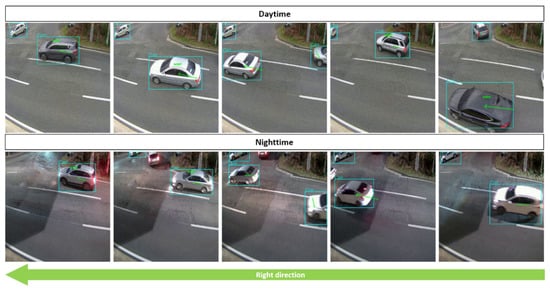Another evaluation we conducted determined false-positive results. The system was tested for 24 h to identify the number of false-positives. Our program counted 5552 cars passing by the camera within 24 h, identifying only one false-positive that occurred owing to the car’s illumination at night (Table 4). Visual results on determining false-positive cases can be seen on Figure 9.