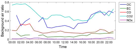 The pollutant concentrations measured in the tunnel were in general much larger than the ambient background concentrations. In Figure 1, we present the diurnal average fraction of background air contribution to each of the measured pollutants. The NOx background concentrations were less than 3% of the tunnel measurement, and the EC background concentrations were around 10%. CO had a higher background contribution, around 20% during the day and 30% in the early morning hours (02:00–04:00). OC and CO2 had the highest contributions from the background. The OC background ratios were 40–60%.