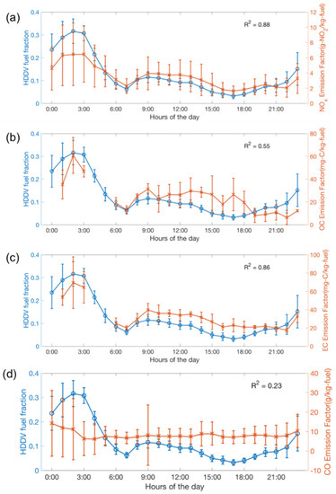 Diurnal patterns of the hourly averaged (a) NOx, (b) OC, (c) EC, and (d) CO emission factors measured in the tunnel on weekdays in spring (right axis) and the heavy-duty diesel vehicle (HDDV) fuel fraction (left axis). Bars represent the standard deviation of the measurement. OC and EC data are not available at 04:00 and 05:00 because the instrument ran a blank sample each day in that period. R2 values show the correlation between hourly averaged % fuelD and emission factor.