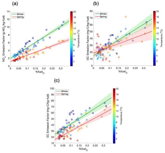 As shown in Figure 3, we observed a seasonal variation in emissions of NOx and EC. NOx and EC emissions were both elevated in winter for the entire % fuelD range. The NOx emission factor we measured in winter was, on average, 1.7 times larger than in spring at all % fuelD, which is larger than the seasonal changes measured by Wang et al. (50%) [36] and Saha et al. (13%) [22]. Regardless of absolute differences, our results contribute to the growing body of evidence that on-road vehicle NOx emissions are higher in winter.