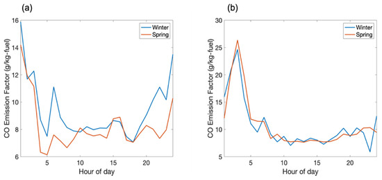 As shown in Figure 2d, the CO emission factor was not correlated with % fuelD. We therefore assessed the potential seasonal variation of the CO emission factor by directly comparing the weekday and weekend diurnal patterns of CO emission factors measured in winter and spring. The results are shown in Figure 4. The CO emission factors were in general similar in winter and spring. During 8:00–19:00 on weekdays and 1:00–21:00 on weekends, when LDV dominate the traffic flow, CO emission factors were similar (in general, less than 10% difference) in winter and spring. During 20:00–7:00 on weekdays, when both the fraction of LDV in the traffic flow and the total traffic volume are lower, CO emission factors were slightly higher (10–51%) in winter than in spring. Wang et al. [36] also reported similar CO emission factors across different seasons.