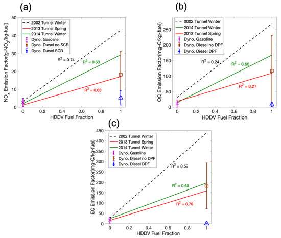 Major changes were instituted in 2007 (for PM) and 2010 (for NOx) for regulating HDDV emissions. May et al. [13] tested HDDV meeting both pre-2007 (no after treatment) and post-2010 (equipped with diesel particulate filter (DPF) and selective catalytic reduction (SCR)) standards. The average dynamometer emission factors of HDDV with and without after-treatment devices are presented in Figure 5 to compare with the tunnel measurements. Tunnel-measured HDDV emissions of NOx, OC, and EC were all similar to dynamometer measurements of untreated (pre-2007) HDDV. Tunnel estimates of HDDV emissions may be biased high because of extrapolation and uncertainty in % fuelD, as described below, and by the uphill grade in the tunnel. Nonetheless, the tunnel measurements suggest that a significant fraction of the on-road fleet consisted of HDDV without exhaust after treatment (i.e., pre-2007 vehicles) during this study.