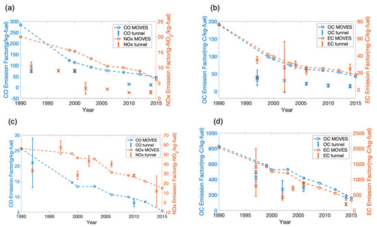 As shown in Figure 6, over the past three decades, measured LDV and HDDV emission factors decreased as the emission standards became stricter. It indicates that stricter emission standards have been effective at reducing on-road vehicle emissions in the U.S. For example, CO and NOx emission factors for LDV have dropped by 70–80% since 2002. Total PM emissions from LDV have also decreased. This decrease is driven by reductions in OC emissions, whereas EC emissions have been essentially flat. Decreasing LDV emissions of OC and stable EC measured in tunnels echo similar trends observed in dynamometer tests [13,17].