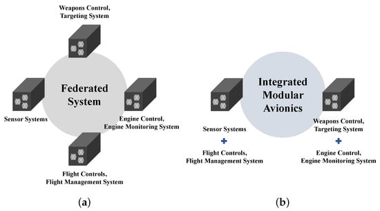 Until the 1990s, aircraft sensors and engine control functions were implemented as individual subsystems called line replaceable units (LRUs) [17] in avionics systems, as shown in Figure 1a. These LRUs consist of a federated architecture, connected via buses, such as, the RS-232, and 1553 analog buses. In a federated architecture, each LRU is connected to an external bus, resulting in slow communication between the LRUs. In particular, additional LRUs are needed to add functionality to avionics systems. For aircraft, only a limited number of LRUs can be added because they have space, weight, and power (SWaP) constraints. Therefore, to deal with more features in aircraft, the IMA architecture [17,18] has been proposed.