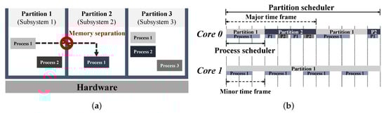 The partitioning system allocates an object called a partition each subsystem. A partition consists of several processes that execute tasks [18]. The partitioning system supports spatial and temporal separation, as shown in Figure 2, to ensure the identical execution of multiple partitions on a hardware unit. As shown in Figure 2a, the memory is divided and allocated to each partition for spatial separation. Each partition has its memory region and cannot access the memory regions of other partitions. Memory access is controlled by a memory management unit (MMU) or a memory protection unit (MPU). Processes within a partition share the memory area allocated to the partition. The partitioning system hierarchically schedules partitions and their processes based on major and minor time frames, as shown in Figure 2b, for time separation. The major time frame is a scheduling sequence in which each partition runs periodically. Meanwhile, the minor time frame is the periodic scheduling sequence of the processes in each partition. The partition scheduler schedules partitions with policies such as round-robin (RR). The process scheduler schedules processes with scheduling policies, such as first-in-first-out and earliest deadline first. The memory space, execution time, and execution period of partitions and processes based on ARINC-653 are defined before runtime. Therefore, neither configuration can be modified at runtime.