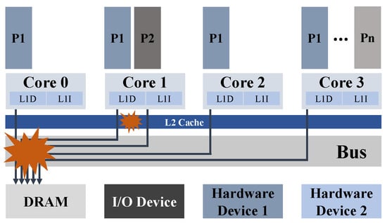 Recently, the amount of data to be processed in avionics systems has increased significantly. Moreover, they conduct complex operations, such as advanced signal processing. Multicore architectures were introduced into avionics systems to meet such requirements. Multicore architectures have the potential to increase throughput using the parallel processing of tasks or hardware resources. However, as shown in Figure 3, multiple cores share hardware resources (e.g., memory, I/O). In particular, hardware resource sharing among the cores can cause interference, such as increased task execution time [23]. Real-time and safety-critical systems, such as avionics systems, must deterministically bound the execution time [23,24,25]. Avionics systems divide the shared memory area and allocate it to each partition to reduce interference. Nevertheless, partitions are still in the same physical memory so interference can still occur. In the multicore IMA system, a model for defining and preventing conflicts between the cores has been studied to aid robust partitioning [26].