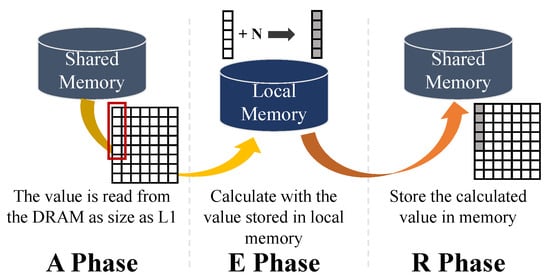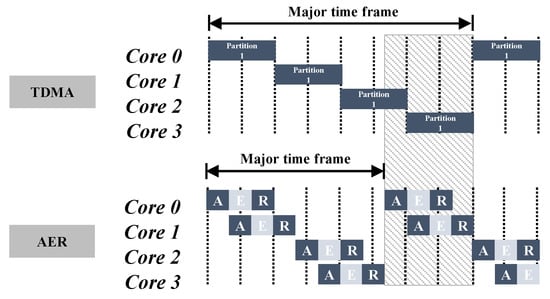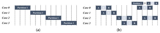 In addition, AER [9,29,30] allows the parallel execution of tasks in each core to improve the limitations of TDMA, as shown in Figure 4b. Tasks are divided into three phases: acquisition, execution, and restitution (denoted by A, E, and R, respectively). The A phase brings data from the shared memory to the local memory, such as a private cache. The E phase performs operations with the data read from the previous phase, and the R phase stores the result in the shared memory. Thus, the E phase can execute concurrently with the A or R phases of other cores by accessing only the local memory. Theoretically, in the AER model, if the execution time of the E phase of one core is longer than the A and R phases of the other core, up to four cores can run simultaneously. However, legacy code may not be split into the A-E-R phases of the AER model.