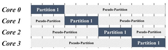 A pseudo-partition is a partition with a single process that executes “while (1) {}”. Based on the predefined partition execution time for each core this pseudo-partition allows only a single core at a time access to the memory. Given that ARINC 653 defines the partitions’ execution period before runtime, the pseudo-partition’s execution period can be set according to the scheduling order. We established a pseudo-partition and heuristically confirmed that the executions on each core did not overlap. This implementation required additional memory space for the six pseudo-partitions to implement TDMA model on a quad-core processor. We used pseudo-partition to control the order of execution between partitions. However, it has the potential to run non-memory jobs instead of pseudo-partitions.
