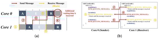 In this work, the AER model is implemented as shown in Figure 8b. Each partition’s processes have phase functions within the main function. When executing the AER model on two cores, Core 1 (1) calls the message receiving function (RECEIVE_QUEUING_MESSAGE ()) and transitions to the block state when the partition process is executed. Core 0 executes the A phase function, and when the execution ends, (2) sends a message to Core 1 (SEND_QUEUING_MESSAGE ()). When Core 1 receives the message, it switches from the block state to the execution state and executes the A phase function. At this time, Core 0 executes the E phase in parallel with the A phase of Core 1. If the E phase of Core 0 is terminated, (3) calls the message send function. When the A phase task of Core 1 is completed, (4) sends the message to Core 0, and the E phase is executed. The E phase of Core 1 terminates, and (5) calls the message sending function for the R phase of Core 0. Core 0 executes the R phase, (6) sends a message to Core 1, and Core 1 executes the R phase. Until the R phase of Core 1 is completed in Core 0, as shown in Figure 8a the non-executing components pause. Therefore, an additional margin is required to set the process deadline for the partition.