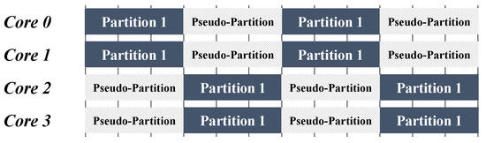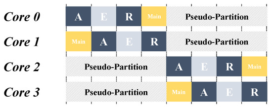 To implement the AER model, we used the pseudo-partition applied to the TDMA model. Unlike TDMA, two cores can run concurrently, thus requiring four pseudo-partitions for the major time frame, as shown in Figure 9. In a previous study that implements the existing AER model [29], the last-level cache (LLC) is disabled so that if a miss occurs in the L1 cache, the main memory is accessed directly. However, disabling the LLC was not possible in our setup. Therefore, we used an array smaller than the size of the L1 cache to minimize the L1 cache misses in the benchmark.