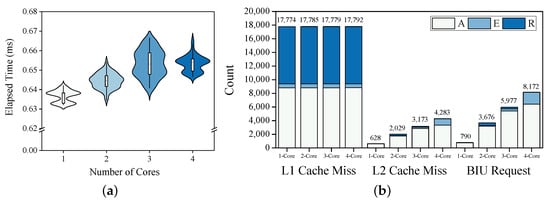 The cache misses measurement results of the benchmark are shown in Figure 13b, where the X-axis represents the variation in the number of cores, and the Y-axis represents the numbers of each item. The L1 cache misses occurred 18,000 times, regardless of the number of cores. At this time, most of the misses occurred in the A and R phases while accessing the shared memory. Approximately 1000 L2 cache misses occurred while executing the benchmark on one core and increased approximately 4.5-fold as the number of cores increased. The BIU requests showed a similar trend and increased more than seven-fold with the increase in the core count being similar to the L2 cache misses. As the number of concurrently running cores increased, the L2 cache misses and the BIU requests in the E phase increased. This means that the execution between processes in each core is not controlled, for it to be executed concurrently with the A and R phases of the other cores. The numbers of L2 misses, and BIU requests during the R phase were small since the data had already been cached in the preceding A and E phases.