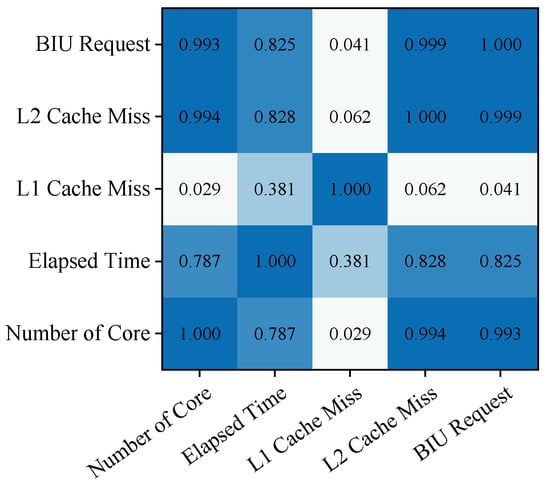Based on these results, we analyzed the correlation of each measurement item, as shown in Figure 14. Based on the measured values, we calculated the Pearson correlation coefficient using MATLAB. From this figure, it appears that execution times are interrelated with the L2 cache misses and the BIU requests. The L2 cache misses are affected by the number of cores running concurrently. Further, the BIU requests were found to be associated with L2 cache misses. In conclusion, the L2 cache misses should be minimized to reduce the impact of memory-sharing interference between cores during execution.