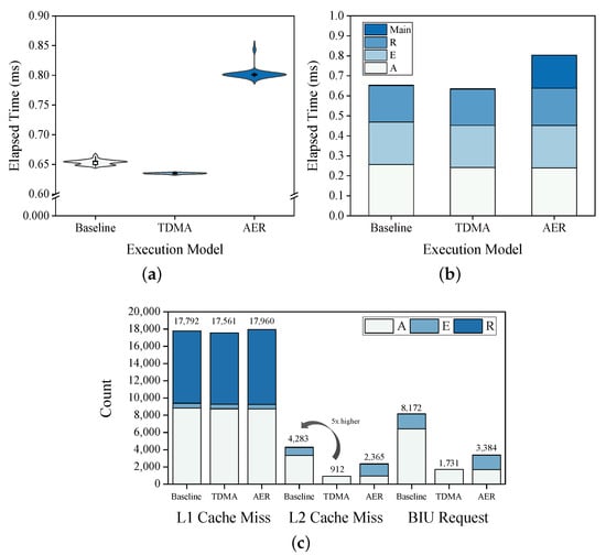 The measurement results of L1, L2 cache misses, and the BIU requests according to each execution model are shown in Figure 15c. TDMA execution model incurred the fewest L1 cache misses. As with the previous results, most of the L1 cache misses occurred in the A and R phases in TDMA and AER. The L2 cache misses count was of the same order as the baseline, AER, and TDMA. The baseline had about 4300 L2 cache misses, mostly in the A phase when reading values from the memory. At this time, because there was no execution control for the processes of each core, the E phase was affected, and the L2 cache misses occurred. There were 2000 L2 cache misses when the TDMA model was run. This is caused by the cold cache when a value initially is read from the shared memory to the local memory. The AER model’s L2 cache misses decreased by more than 60%, compared to the baseline. However, approximately 2000 additional L2 cache misses occurred in the E and R phases due to the message calls context switching and each phase control’s send and receive functions. The BIU requests of each model appeared in the order of baseline, AER, and TDMA. In TDMA, the BIU requests were also lower because there were minimal L2 cache misses during the E and R phases. Consequently, the TDMA and AER models reduced interference. However, in the case of AER, 23% of the execution time was required for each phase control action.