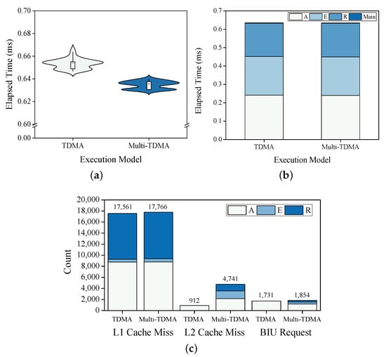 The result of applying the multi-TDMA model is shown in Figure 16. The execution times of the TDMA and multi-TDMA models were 0.65 ms and 0.63 ms, respectively on average, as shown in Figure 16a. The execution time for the A, E and R phases were 0.24 ms, 0.21 ms, and 0.18 ms respectively in both models, as shown in Figure 16b. The variations in the execution times of the models were 0.02 ms and 0.01 ms, respectively. These values are negligible in the cache misses results of Figure 16c, multi-TDMA showed the greatest value in all categories, particularly in the number of L2 cache misses. The L2 cache misses of the TDMA and multi-TDMA were 911 and 4741, respectively. Thus, the L2 cache misses in the multi-TDMA were approximately five times more. This caused more cache misses, as two cores accessed the memory simultaneously. In Figure 13b, when two cores ran the benchmark concurrently, there were about 2000 L2 cache misses, but about twice as many occurred in the multi-TDMA. In the previous experiment each core had one partition but in the multi-TDMA experiment, two partitions were allocated per core. We considered this difference as an overhead for partition scheduling. The number of the BIU requests in the multi-TDMA model was approximately 2000, which is similar to the TDMA model as shown in Figure 16c. Because the BIU requests differences in the multi-TDMA model were insignificant, it appears that this will not affect execution times.