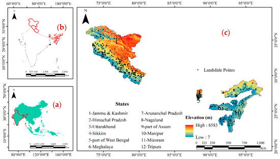 (a) Southeast Asia highlighting India; (b) geographical boundaries of India highlighting the Indian Himalayan region; and (c) location of rainfall-induced landslides in the Indian Himalayan region [1] (DEM Source: SRTM, resolution 30 m).