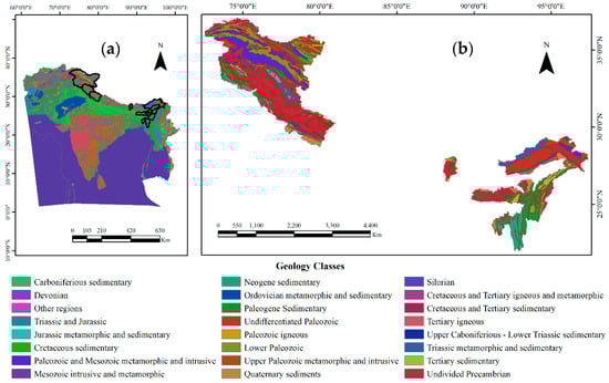 Geology of: (a) South Asia highlighting the Indian Himalayan region; and (b) the study region (Source: USGS World Geologic Map).