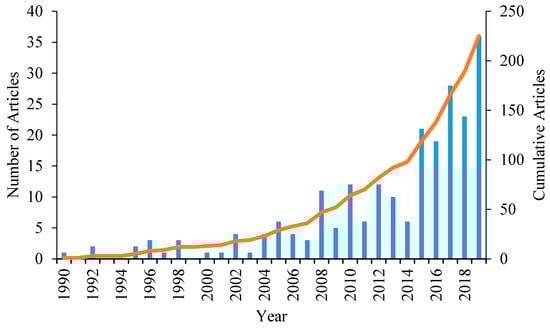 Analysis of the literature database during 1990–October 2019 from Web of Science. The left ordinate axis represents the number of articles per year and the right ordinate axis depicts the cumulative number of articles during the entire analysis period.