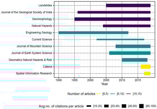 The articles were published across 75 different journals, with nearly 60% of the works published in 11 journals (Figure 4). The articles were initially majorly published in Engineering Geology and Geomorphology. The focus has shifted towards other journals such as Natural Hazards, Landslides, and Geomatics, Natural Hazards and Risk. Generally, after a major landslide event, the preliminary report is published in Current Science. However, extensive analysis of landslide study misses in such journals and is mostly focused on post-landslide studies.