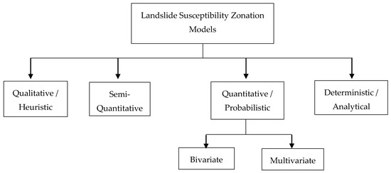 Landslide hazard is defined as the probability of landslide occurrence of a specific type (“when” or “how frequent”) and magnitude (“how large”) [12]. The spatial probability of landslide hazard is assessed by carrying out landslide susceptibility mapping or popularly known as landslide hazard zonation mapping. Landslide susceptibility assessment determines potential of landslide event considering several predisposing factors and investigating their spatial distribution [12]. The spatial occurrence of landslides is controlled by several and sometimes inter-playing factors such as geological setting, rainfall, morphology, soil, and vegetation conditions, thus landslide susceptibility assessment is not a straightforward task, and many methodologies have been developed to assist the susceptibility analysis. The classification techniques used for landslide susceptibility models has also changed over time. We categorized them into four groups: Qualitative, Semi-quantitative, Quantitative, and Deterministic (Figure 7). In this section, we explore the models, the parameters used, and the trend in susceptibility analysis.