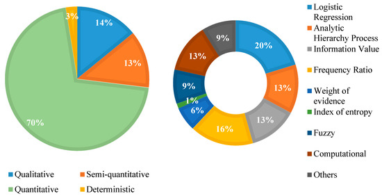 Quantitative models depend on the landslide density under each influencing factor and can be further classified as a bivariate and multivariate [74]. Both bivariate and multivariate statistical models compute weights; however, multivariate techniques depend on the collective effect of parameters [75,76]. Bivariate statistical methods include weights of evidence, frequency ratio, information value, and the combination of frequency ratio and fuzzy methods [77,78,79]. The most popular multivariate model used is logistic regression [80]. The analysis shows that most studies have used quantitative techniques, of which logistic regression has been most used [81,82,83]. Thereafter, frequency ratio and information value were used 16% and 9% of the studies, respectively [74,84,85,86,87,88]. In terms of semi-quantitative models, AHP has been the most used method (Figure 8).