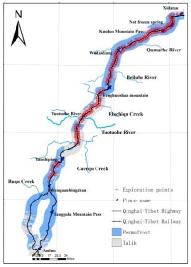 - Jin, H.J.; Yu, Q.H.; Wang, S.L.; Lu, L.Z. Changes in permafrost environments along the Qinghai–Tibet engineering corridor induced by anthropogenic activities and climate warming. Cold Reg. Sci. Technol. 2008, 53, 317–333. [Google Scholar] [CrossRef]