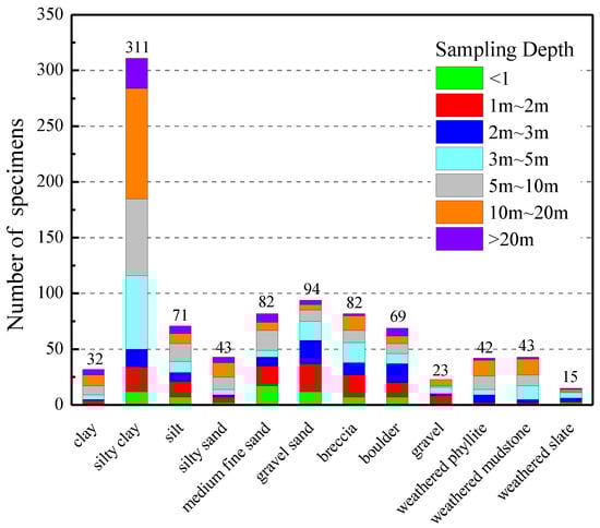 To guarantee the experiment’s progress and data representativeness, the specimens with large dry density, high water content, and number of samples less than 15 were not measured in the test. According to the classification criteria of geotechnical engineering, the remaining 907 specimens were identified as 12 types (see Table S1 in Supplementary Materials). The statistic numbers of test samples for certain soil types are shown in Figure 2. It can be seen from the figure that silty clay is the dominant soil type in the QTEC (>30%), and the following is sandy and gravel soil (about 20%), which is basically equivalent.